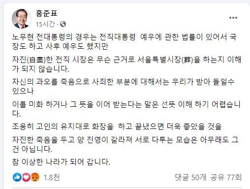 "자진한 전직 시장을 무슨 근거로 서울특시장을 하는지