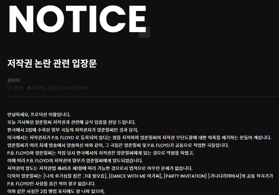 이에 따라 P.B. FLOYD의 저작권의 일부가 양준일씨에게 양도되었습니다"