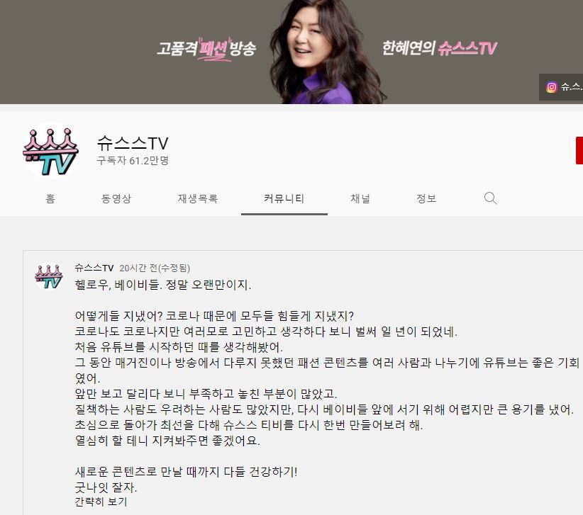 한혜연은 24일 자신의 유튜브 채널 '슈스스 TV' 커뮤니티 게시판에 "헬로, 베이비들. 정말 오랜만이지"라고 시작하는 글을 남겼다.