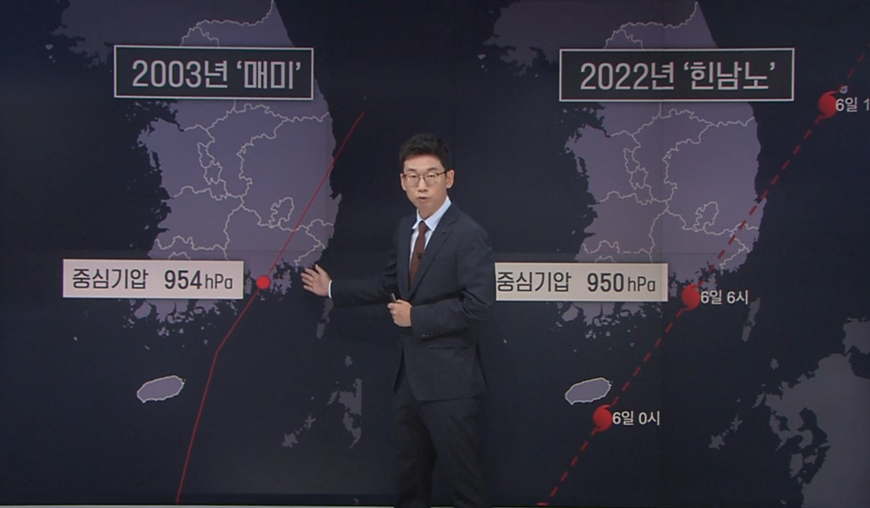 한반도에 상륙 당시 태풍 매미는 중심기압이 954hPa 이었고 이번 힌남노는 중심시압이 950hPa 로 매미보다는 조금 약한 것으로 확인 되고 있습니다.