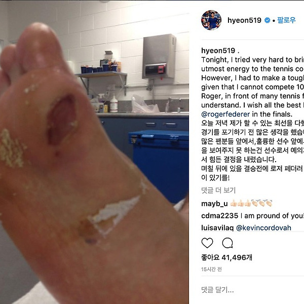 정현 발 사진공개 드러난 속살 힘든 결정 내렸다정현 의 발 사진이 국민들에게 감동을 안겨주고 있습니다.정현은 26일 호주 멜버른에서 열린 2018 호주 오픈 로저 페더러와 준결승전 에서 1세트를 1-6으로 내준 뒤 2세트 2-5로 뒤진 상황에서 발 부상으로 기권을 했습니다.2세트 도중 정현은 발의 통증을 호소 하며 양말을 벗었는데요 그런데 발바닥에서는 엄청난 양의 테이핑이 되어 있었습니다.테이핑을 가위로 자른 후 정현은 기권을 했는데요.이후 정현은 자신의 인스타그램에 상처 투성이인 정현 발 사진과 함께 글을 남겼습니다.정현은 “오늘 저녁 제가 할 수 있는 최선을 다했습니다. 경기르 포기하기 전 많은 생각을 했습니다. 많은 팬분들 앞에서 훌륭한 선수 앞에서 내가 100%을 보여주지 못 하는 건 선수로서 예..