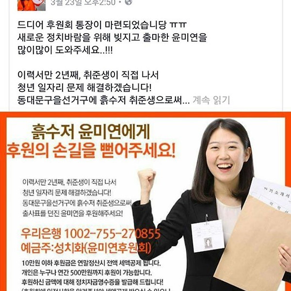 25세 윤미연 후보 흙수저 재산이 9천만원자칭 흙수저 라는 표현을 쓰며 4.13 총선에 출마한 민중연합당 윤미연 후보(25)가 논란에 휩싸였다.윤미연 후보의 개인 재산 때문에 벌어진 일인데요 서울 동대문을 선거구에 출마한 흙수저당 윤미연 후보는 8961만 9000원의 재산을 중앙선거 관리위원회에 신고하면서 25세의 나이에 재산이 9천만원을 가진 사람이 흙수저 란 표현을 쓰는 것이 적당한가 라는 논란이 일고 있습니다. 윤미연 후보는 중소기업금융재권 등 채권을 4100만원, 은행예금 1600만원, 이외 보험등을 합해 9000만원을 신고했는데요 대학 졸업 후 2년간 취업준비를 한 학생이 이정도 재산이 가능 한가요?사실 대학을 다니면서 학자금 대출을 받고 졸업 한 대학생의 경우 사회에 첫발을 내딛기 전에 수천만..